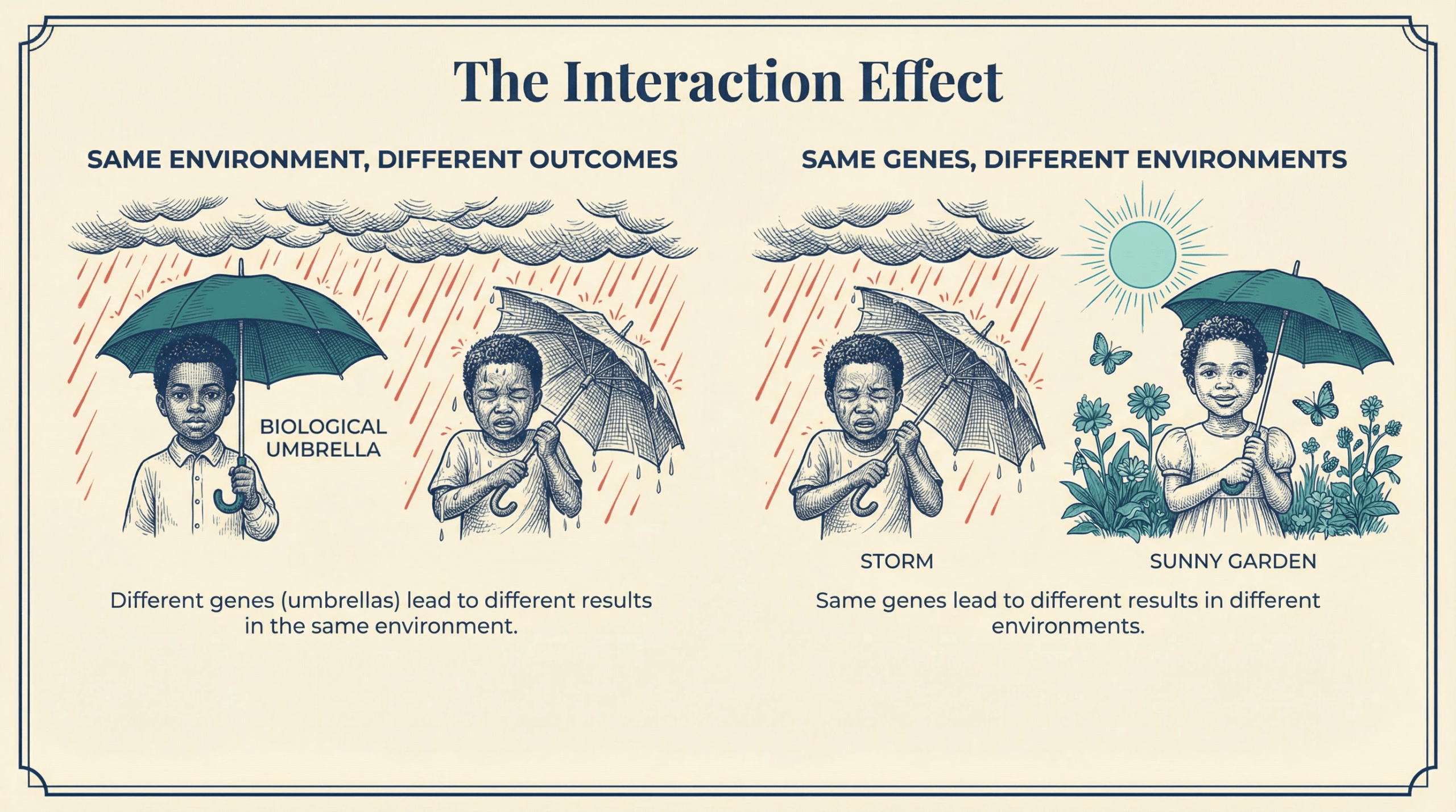 • Gene–environment interaction explains individual differences